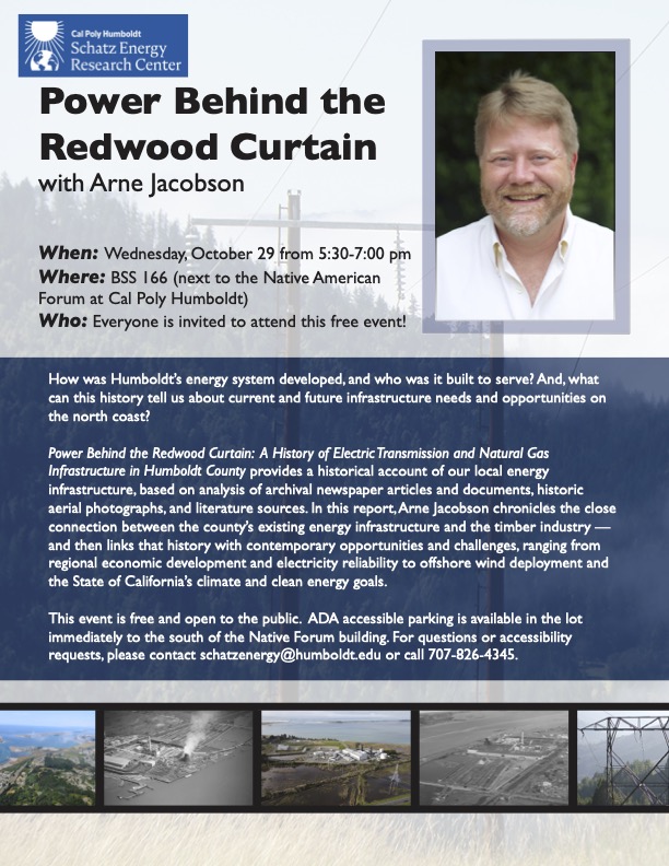 A new report from the Schatz Energy Research Center provides a detailed historical account of the energy infrastructure that serves Humboldt County. Power Behind the Redwood Curtain: A History of Electric Transmission and Natural Gas Infrastructure in Humboldt County is written by Schatz Center director Arne Jacobson, and based on analysis of archival newspaper articles and documents, historic aerial photographs, and literature sources.