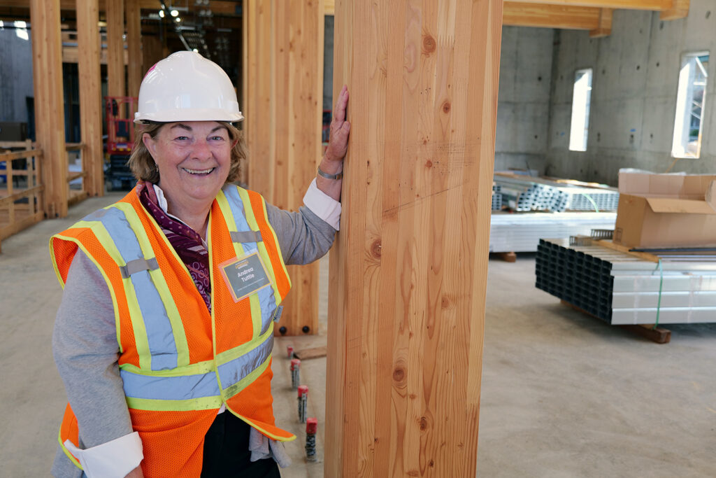 - Andrea Tuttle, former Director of the California Department of Forestry and Fire Protection and consultant for forest and climate policy (pictured above, admiring the mass timber beams of the new engineering building in October 2025)